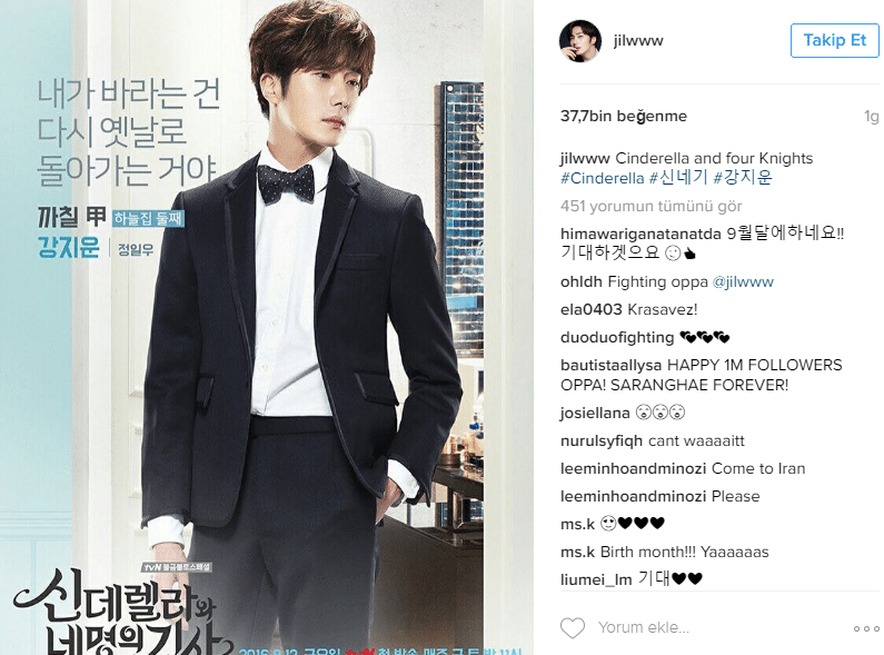 Jung Il Woo 18 Temmuz’da Instagram hesabından paylaştığı fotoğrafla yaklaşan draması Cinderella and the Four Knights‘ın tanıtımını yaptı!