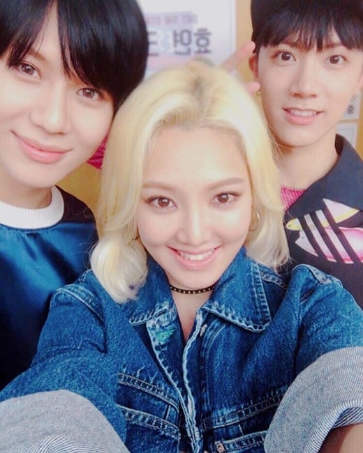 SNSD’den Hyoyeon, ‘Hit The Stage’ çekimlerinde SM kadrosundan Ten ve Taemin ile çekildiği bir fotoğrafı paylaştı.