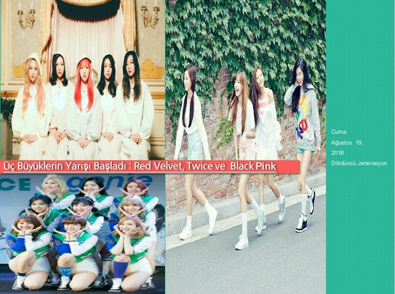 4. Jenerasyonun Lider Kız Grupları : Red Velvet [SM], Twice [JYP], Black Pink [YG]