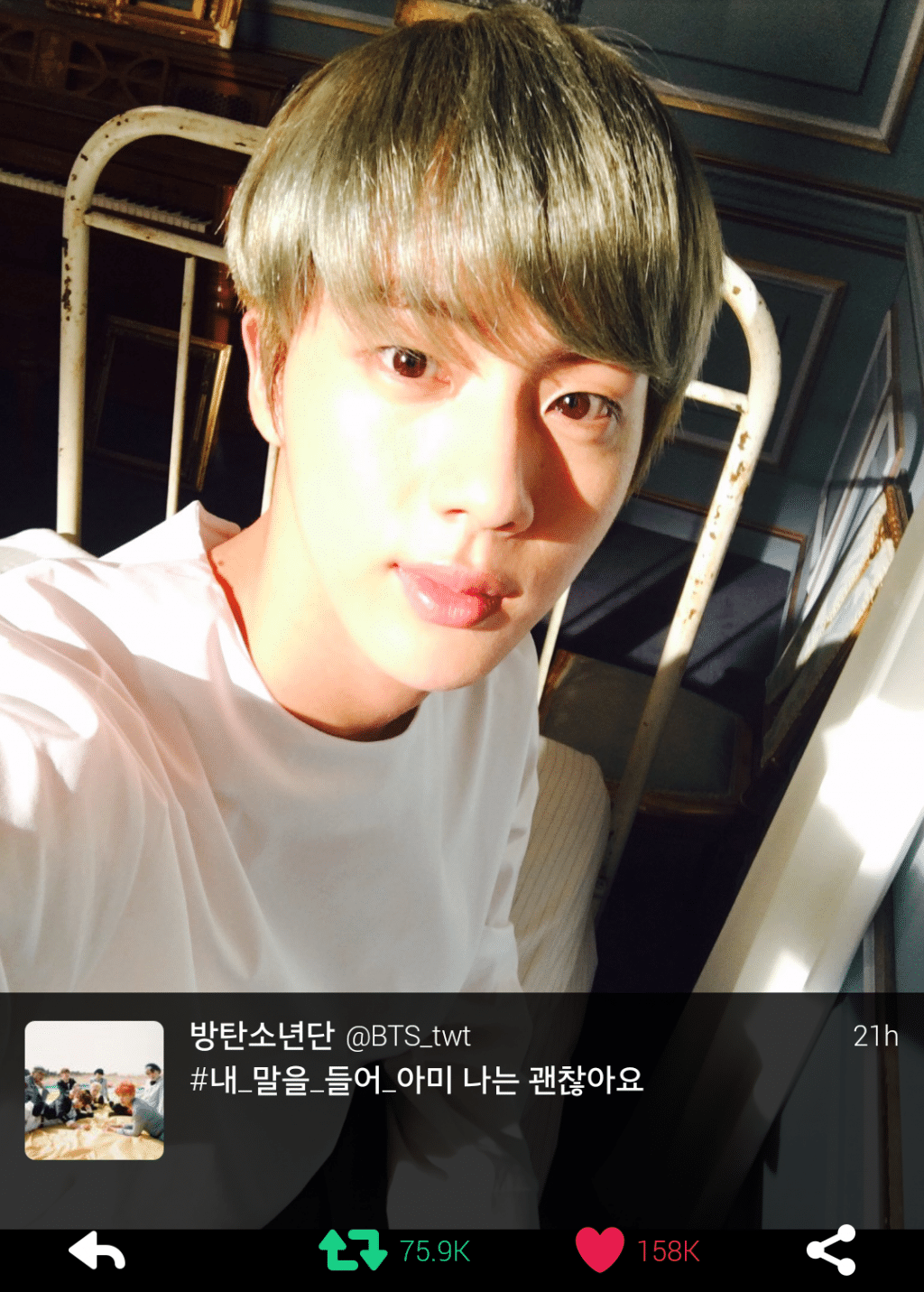 Jin, 29 Ağustos’da kendi fotoğrafını, “Beni dinle, Army. Ben iyiyim.” yazarak paylaştı. Ondan önceki gün fandom ve Jin arasında “Listen to me, Seokjin” esprisi, tag olmuştu ve Jin de buna gönderme yaptı.