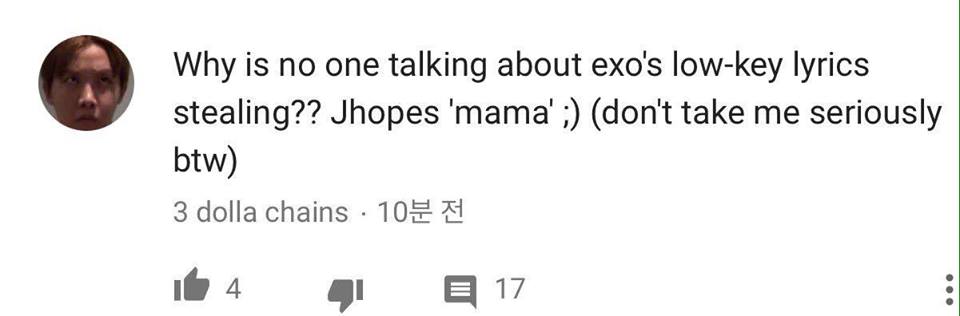 YouTube’da BTS fandomundan birçok kişi, EXO’nun çıkış yapacak olan alt grup EXO-CBX‘in, çıkış parçası olarak yayımlayacakları ‘Hey Mama’ teaserı yayımlandıktan sonra, BTS üyesi J-Hope’un ‘Mama’ şarkısıyla kıyaslamaya başladı ve onlara göre iyi olmayan alt grup EXO-CBX’in eser hırsızlığı yaptığını savunan paylaşımlar YouTube’da SMTown hesabında bulunan MV teaserının altında yayınlayarak ortalığı karıştırdılar.