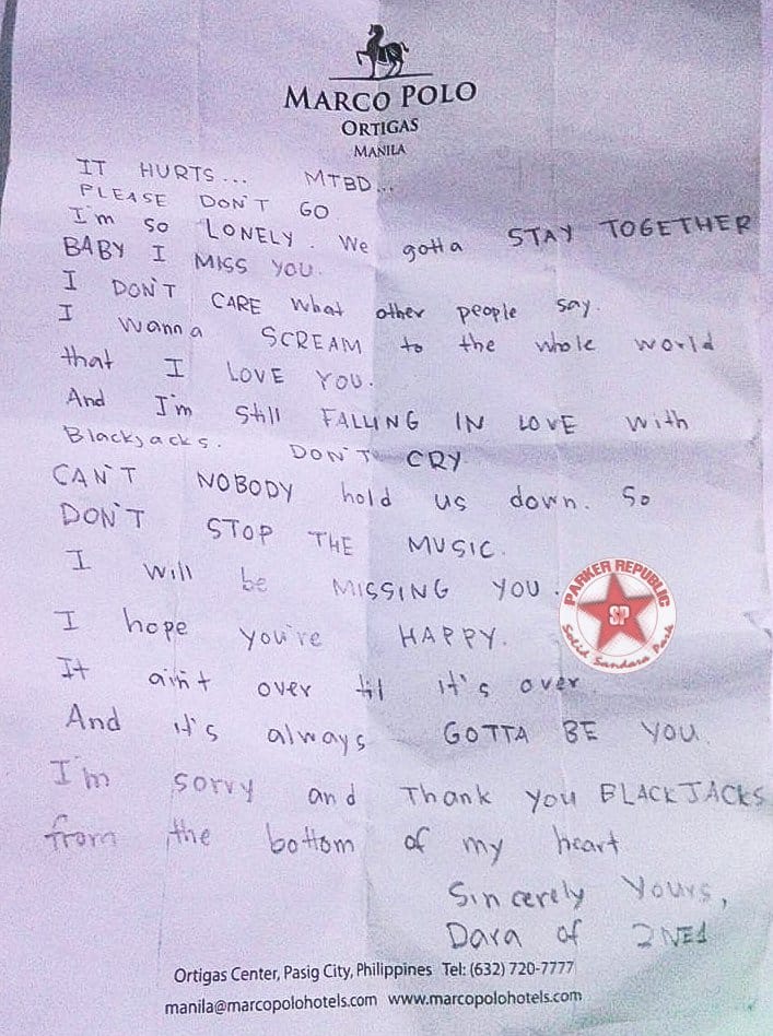 Mektup Marco Polo Ortigas Manila adresinden yayımlandı ve bu mektubu Sandara ‘nın Filipinler’ de kaldığı otelde hayranları için kaleme aldığı iddia ediliyor. Mektupta Sandara’nın Blackjack’lere verdiği değer ve onları aile gibi görüşü gerçeği bulunuyor. Mektupta Dara duygularını paylaşmak için 2NE1’ın popüler şarkı sözlerini kullanıyor.
