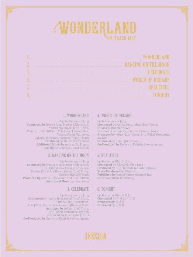 Jessica ‘Wonderland’ adını verdiği ikinci mini albümü ile mükemmel bir geri dönüş yapmaya hazırlanıyor. Yayımlanan tanıtım videoları ve resimlerin ardından hayranlarının beklentisi bir hayli yüksek. Son olarak ise ‘Wonderland’ albümünde yer alan şarkların parça listesi açıklandı.
