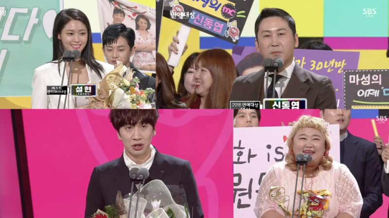 Bu kapsamda 2016 SAF SBS Entertainment Ödülleri ise 25 Aralık’ta Seul‘da SBS Prism Tower binasında Lee Kyung Kyu, Kang Ho Dong, ve Lee Si Young’un ev sahipliğinde gerçekleştirildi. Gecede en prestijli ödül için ; Yoo Jae Suk, Shin Dong Yup, Kim Gura, Kim Gook Jin ve Kim Byung Man aday gösterildi. Ve nihayetinde büyük ödülü evine götüren kişi Shin Dong Yup oldu. Shin Dong Yup ödülü “My Ugly Duckling,” ile alırken En İyi Senarist Ödülünü (Yook So Young), En İyi Yapımcı Ödülünü (Park Soo Hong), ve Yılın Ödülü ile Varyete Mükemmellik Ödülünü (Seo Jang Hoon) kazandı.