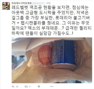 Bir Twitter hesabından şampiyonada Idol gruplarının hayranlara verdiği yemeklerin güzelliği, kaliteli olması karşılaştırıldığında. Fandomlar öfkelendi.