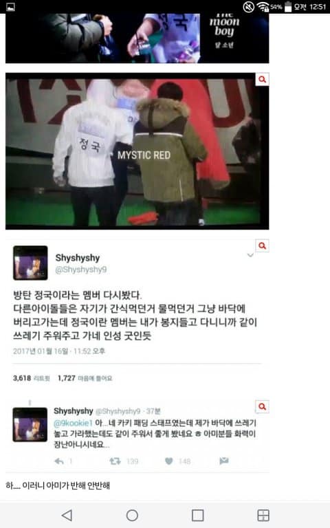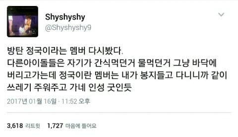 “BTS üyesi Jungkook’u yeni bir şekilde görüyorum. Diğer idoller abur cuburlarını ve su şişelerini öylece yerde bıraktılar ama Jungkook adındaki üye naylon poşet alıp çöpü ona vermemi söyledi. Kişiliği iyi”