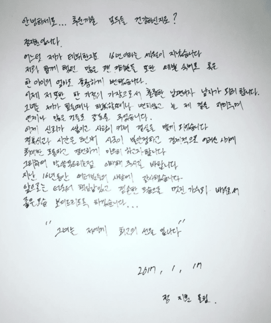 Ben Jung Ji Hoon. Çıkış yapmamın üzerinden 16 yıl geçti ve o zamanlardan hayranım olan birçok kişi şimdilerde mükemmel güzel anneler oldular. Artık bende bir aile yaşantısı için koca olmak istiyorum. [Kim Tae Hee] zor günlerimde her zaman yanımda oldu ve bana destek vermeden vazgeçmedi. Böylesine güçlü olan bağımız zamanla daha da ilerledi ve sevgiye dönüştü. Ve nihai kararı aldık