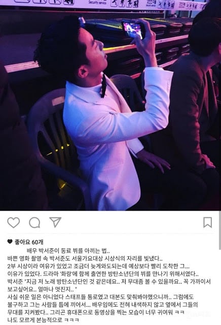 Orası personeller için olduğundan ve repliklerin provasını yapmak zorunda oldukları için bu kolay olmadı… Ama buna rağmen onların yanında durdu… Oyuncu olmasına rağmen personellerin yanında sahneyi izledi… BTS’in performansını telefonuyla çekerken çok sevimliydi ㅋㅋ o yüzden fark etmeden bir fotoğraf çektimㅋㅋ”