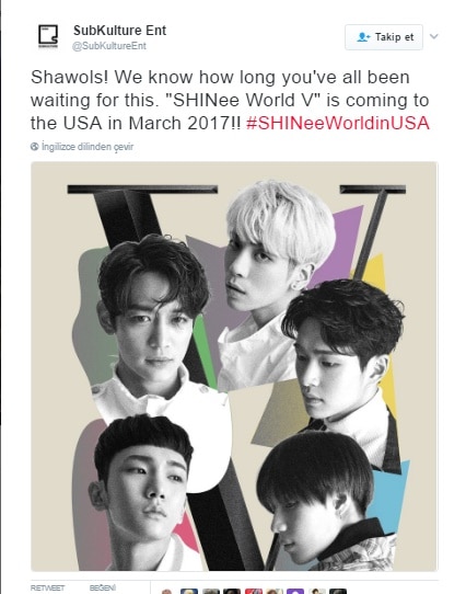 SubKulture Entertainment sosyal medya hesapları aracılığıyla bildiri yaptı. Açıklamayla birlikte tur için bir poster yayınlandı, “Shawols! Bunu ne kadar beklediğinizi biliyoruz! ‘SHINee World V’ Mart 2017’de ABD’ye geliyor!