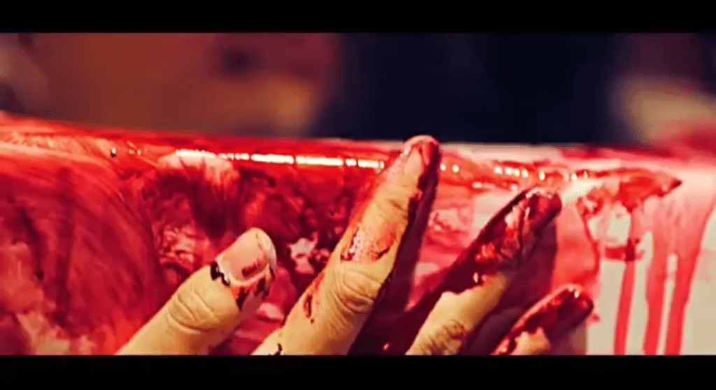 Videoda bir üyenin kana bulanmış küvetten sarkıyor.
