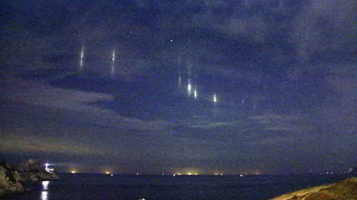 Bunun bir aurora ışıklarından UFO ışıklarına kadar uzanan tahminleriyle nihayet Ulusal Hava Servisi, bulutların altından yansıyan tekne ışıklarının bu ışık sütunlarının oluşmasına neden olduğunu açıkladı.
