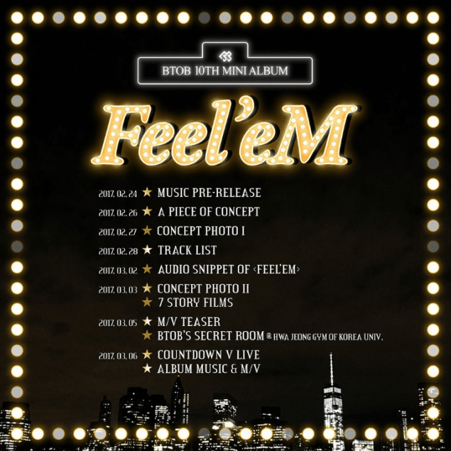 24 Şubat ile 06 Şubat arasında geri dönüş süreci yaşanacak.BTOB’nin onuncu mini albümü ‘Feel’eM‘ için önce konsept tanıtım fotoğrafları yayınlanacak ardından 28 Şubat’ta şarkı listesi yayınlanacak.Diğer tanıtımlarında yayınlanmasının ardından 05 Şubat’ta son tanıtım videosu yayınlanacak ve 06 Şubat’ta ‘V Live‘ yayını yapılacak.Ardından BTOB’nin yeni albümü piyasaya sürülecek.