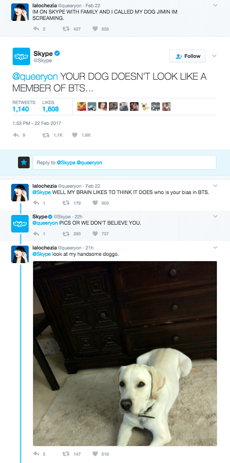 22 Şubat’ta Twitter kullanıcısı @queenryon, ailesiyle Skype görüşmesinde yanlışlıkla evcil hayvanının “Jimin” olarak adlandırdığı hakkında tweet attü. Skype’ın Twitter hesabı, tweet’e köpeğinin BTS üyelerinden biri gibi görünmediğini söyleyerek yanıtladı.