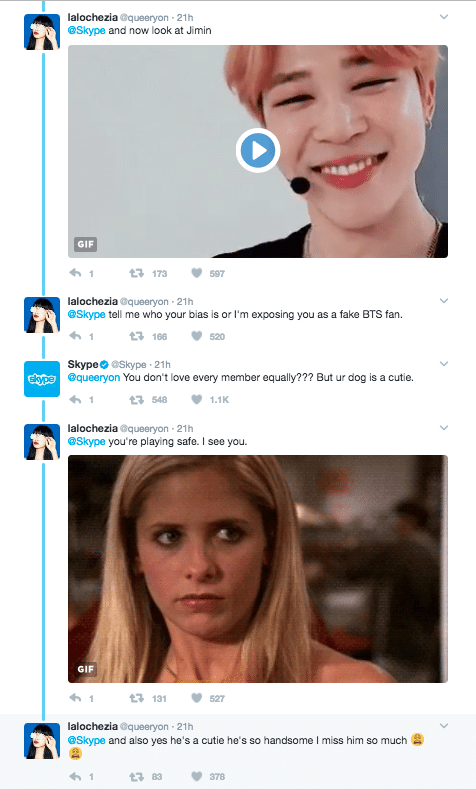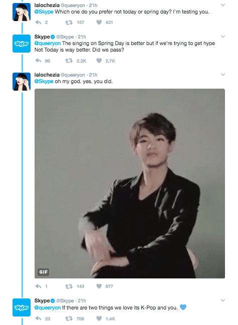 Sosyal Ağ Şirketi Skype son zamanlarda Twitter’da K-Pop’ı sevdiklerini ve BTS’nin büyük bir hayranı olduklarını gösterdi.