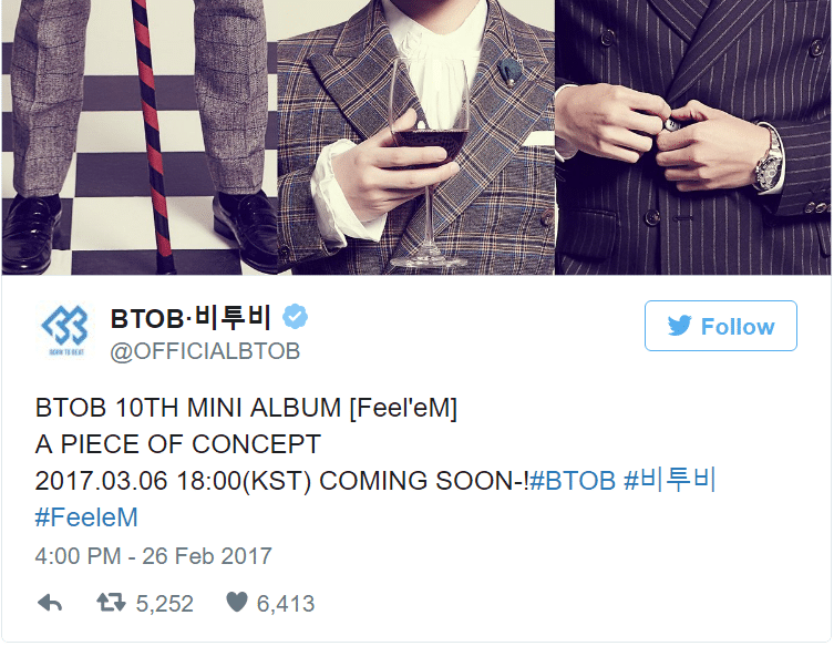 BTOB 10. mini albümleri olan “Feel’eM”i 6 Mart’ta saat 18.00’da (Kore Standart Zamanına göre) piyasaya sürecek. Ve geri dönüş programlarına göre de tanıtım fotoğrafları çok yakında çıkacak.