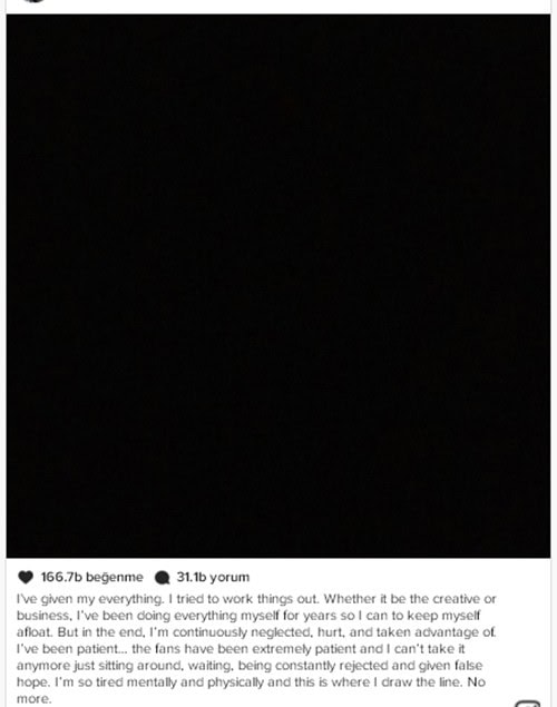 “Herşeyimi verdim. İşleri yoluna koymaya çalıştım. Yeniden üretmek ya da yapılanlara yardımcı olmak olsun. Yıllardır elimden gelen herşeyi yapıyorum bu nedenle ayakta kalabildim. Ama son zamanlarda sürekli ihmal ediliyorum, inciniyorum ve menfaatine davranıldığını görüyorum. Sabrettim….. Hayranlarımda en az benim kadar sabırlılardı. Ve ben artık böyle eli kolu bağlanmışçasına oturup beklemeyi, sürekli reddedilmeyi , boşu boşuna umutlanmayı bekleyemem. Hem psikolojik hem de fiziksel anlamda gerçekten çok yoruldum.