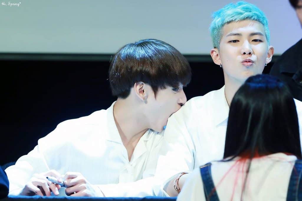 Junkook, bir fan buluşmasında Rap Monster’ın omzunu ufak bir şekilde ısırarak sevgisini gösteriyor. Kookie Monster acıkmış gibi görünüyor!