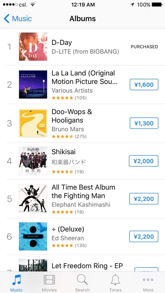 - Albüm 28 Mart’ta yayınlandı. Bu sadece dijital albümdür. Fiziksel Albüm 12 Nisanda yayınlanacak. Aşağıda Daesung’un Japonya’daki iTunes Pop, K-Pop ve Genel albümler grafiklerindeki “D-Day” sıralamaları yer alıyor.