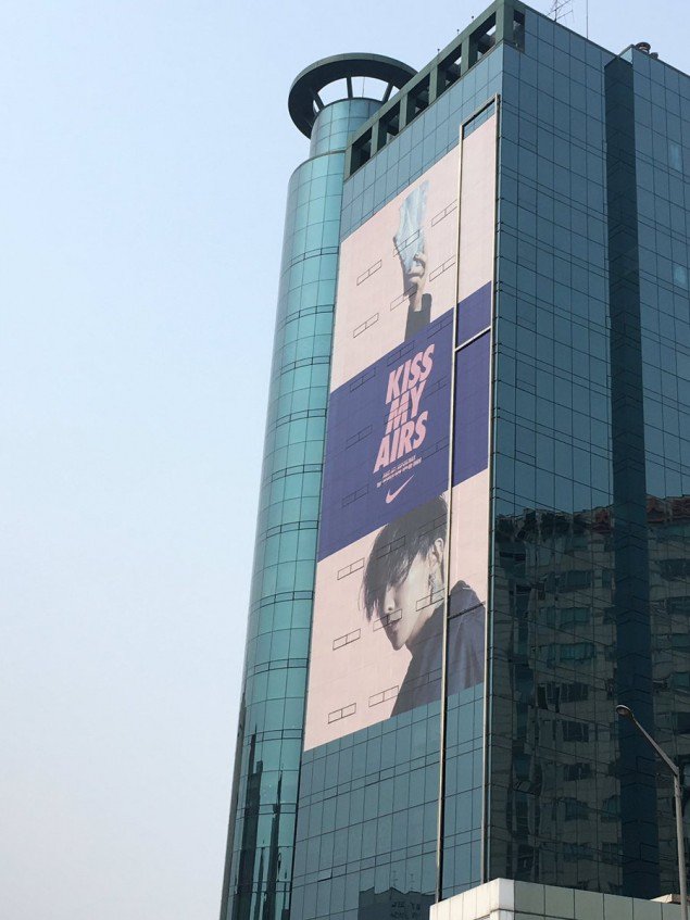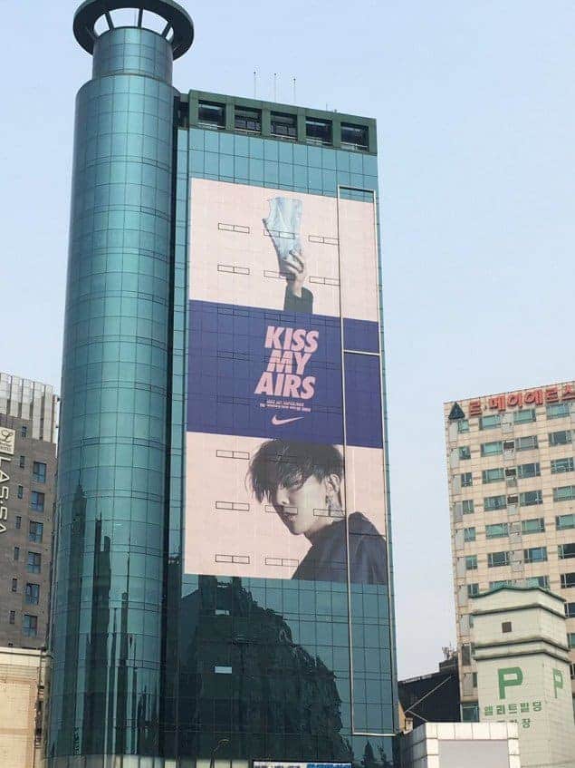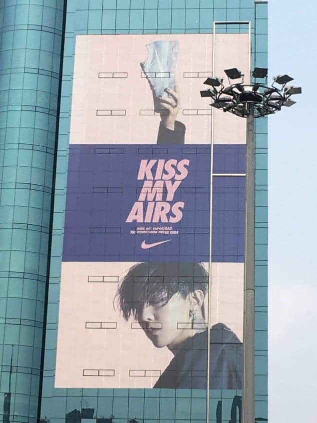 Big Bang’den G-Dragon, dünya spor markası Nike ile ilkbahar fotoğraf çekiminin ardından resmi ‘Kiss My Airs’ reklamında oynadı. Ayrıca hayranlar, Korenin Sinchon kentindeki bir binanın üzerinde olan büyük bir ilan panosunun fotoğrafını paylaştılar.