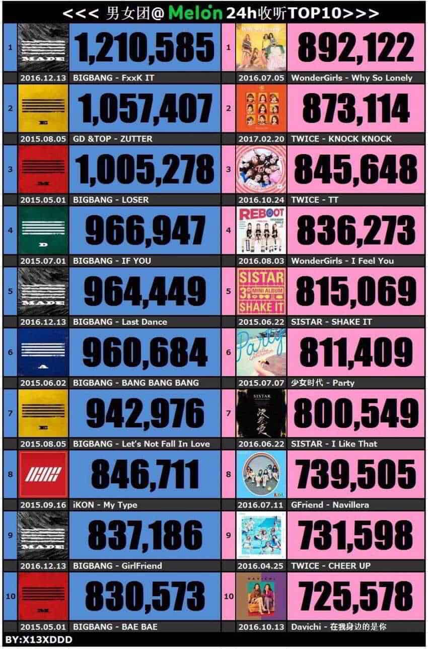 Pann : MelOn listesinde 24 saat içerisinde en çok dinlenme sayısına ulaşan idol grupları
