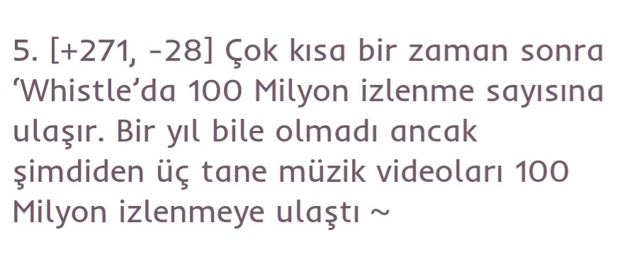 5. [+271, -28] Çok kısa bir zaman sonra ‘Whistle’da 100 Milyon izlenme sayısına ulaşır. Bir yıl bile olmadı ancak şimdiden üç tane müzik videoları 100 Milyon izlenmeye ulaştı ~