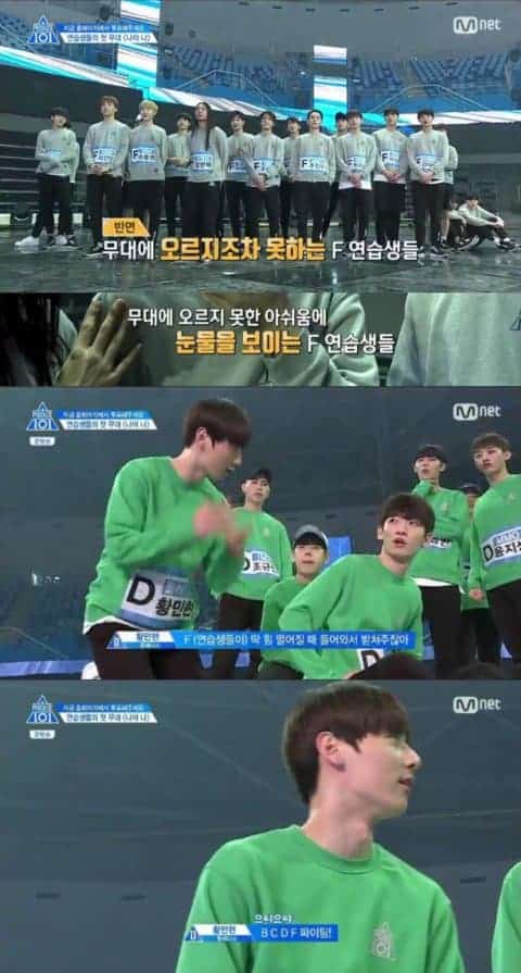 *Bazı F sınıfı stajyerleri sahneye çıkamadıkları için göz yaşları döktüler* (ç/n: Bunların içinde Minhyun’un NU’EST’den grup arkadaşı Choi Min Ki-REN de vardı)