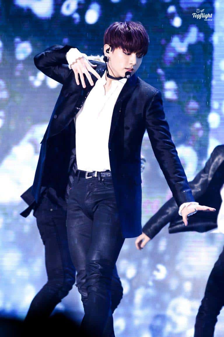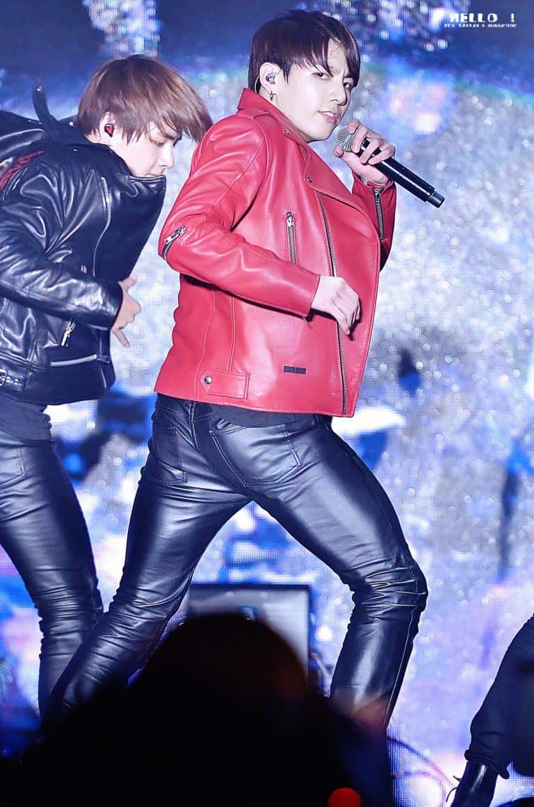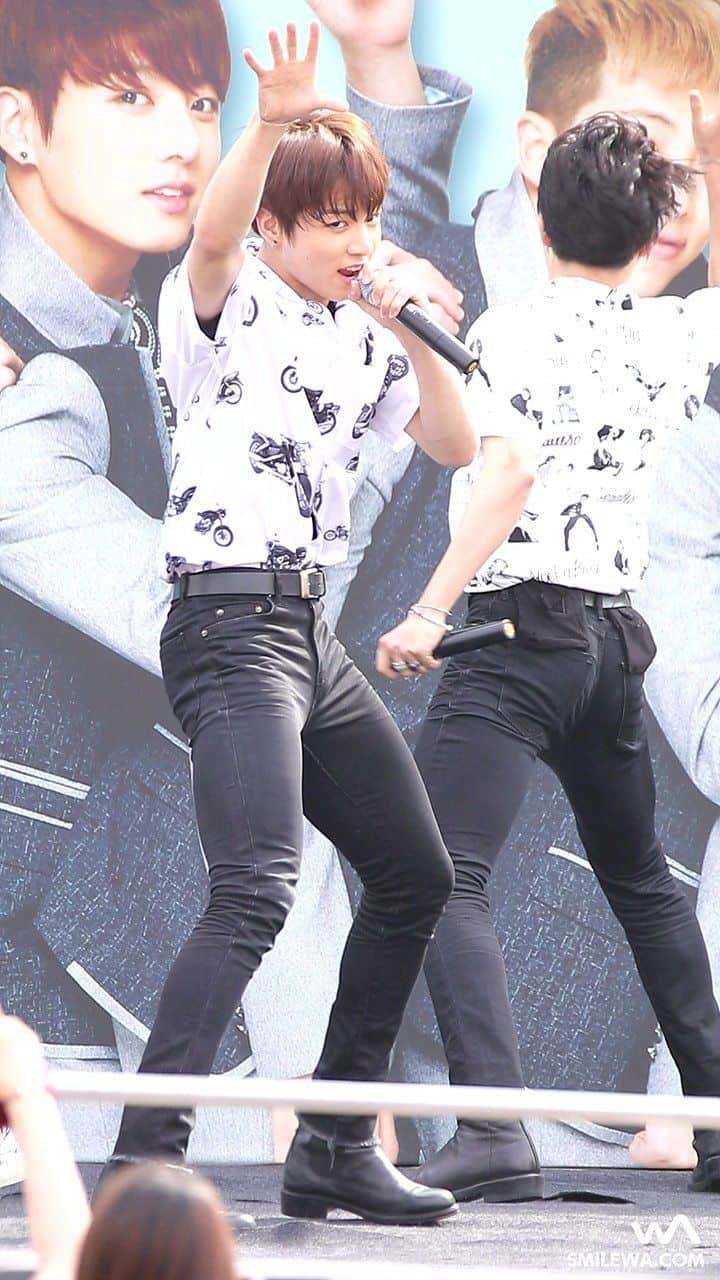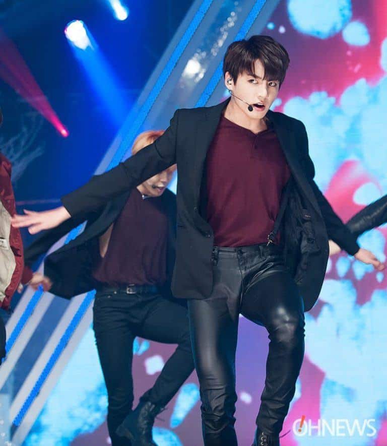 Kaslarından dolayı patlayacak gibi duran gömleğinin düğmelerinin dışında Jungkook’un sık sık giydiği dar pantolonlar ile bacak kasları da ortaya çıkıyor. Egzersiz yaptığı açıkça belli.