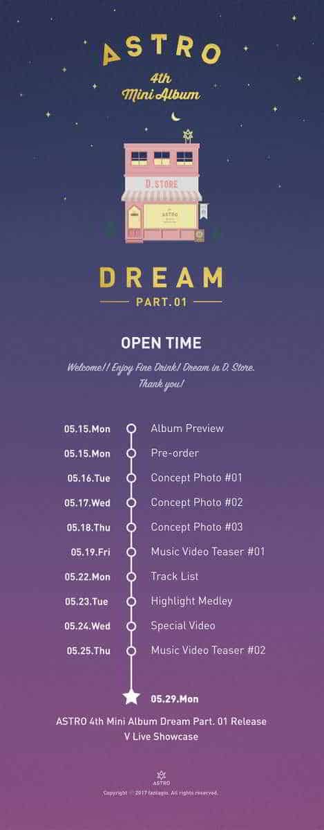 Kore saatine ve tarihine göre 11 Mayıs’ta Fantagio’un resmi Twitter adresinden ASTRO’nun dördüncü mini albümünde yer alan ana şarkı “Dream Part.01”için ilk tanıtım yayınlamıştı.