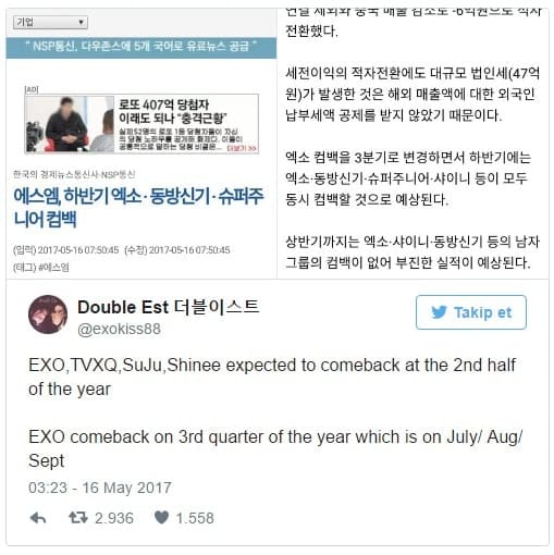11. SM sadece EXO’dan ibaret değil ve bir çok grubun geri dönüşü bekleniyor. EXO’nun comebacki Temmuzda olur diye düşünüyorum ben. Çok sorunlu… Temmuzun sonunda çıkacak olsalar bile aynı anda nasıl SMTOWN Japonya’ya katılacaklar ve nasıl promosyon yapacaklar… Bu imkansız.