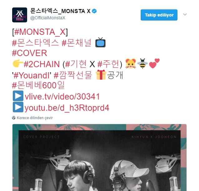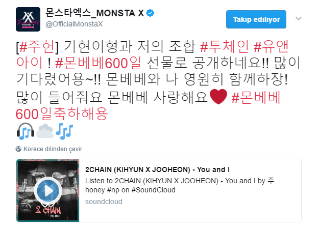 [Jooheon] Kihyun hyung ve benim işbirliğimiz #2Chain, #YouandI !! Bunu#Monbebe600thDay hediyesi olarak paylaşıyoruz! Çok uzun süre beklediniz~! Monbebe ve ben sonsuza kadar birlikte kalalım! Lütfen çokca dinleyin. Monbebe, sizi seviyorum #Monbebe600GünümüzKutluOlsun