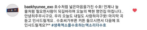 “Suho, bir göl kadar büyük bir kalbi var! Umarım, her zaman ihtiyaç duyulan biri olur tıpkı su gibi. Bunlar Baekhyun’un bugün ki son sözleri. İyi geceler. Bugün ve yarın her şeyi sevelim! Son olarak, size bir şarkı adı veriyorum. Uyumadan önce, Suho tarafından söylenen ‘Curtain’i dinleyin, bir daha ki seferde görüşmek üzere?^^