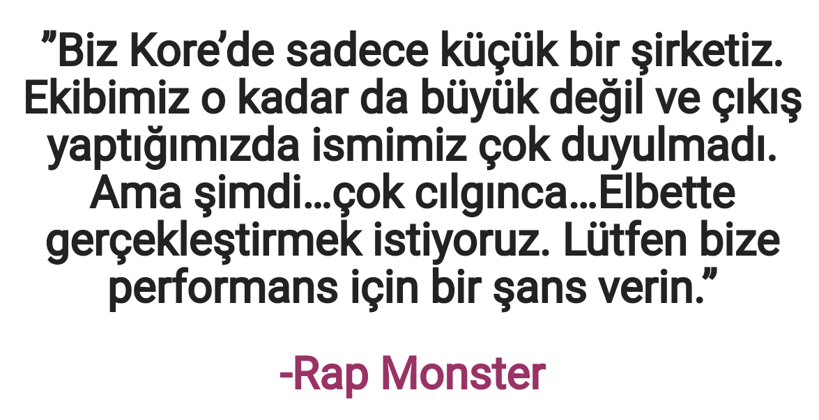 ”Biz Kore’de sadece küçük bir şirketiz. Ekibimiz o kadar da büyük değil ve çıkış yaptığımızda ismimiz çok duyulmadı. Ama şimdi…çok cılgınca…Elbette gerçekleştirmek istiyoruz. Lütfen bize performans için bir şans verin.”
