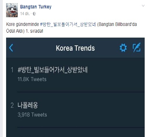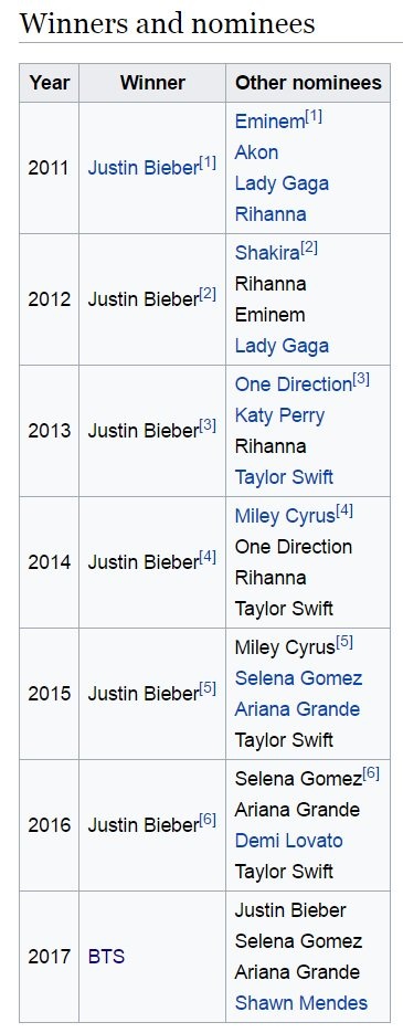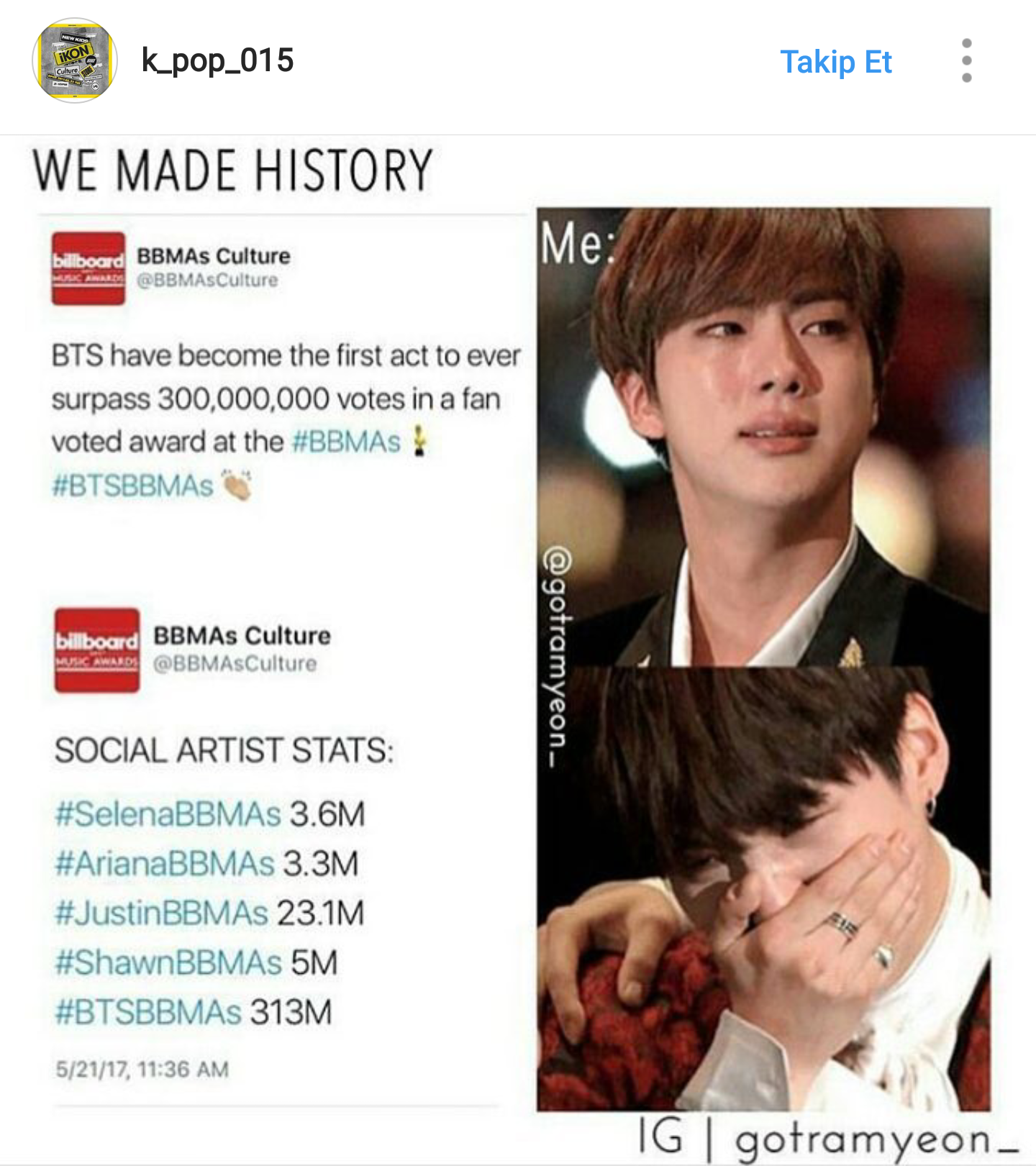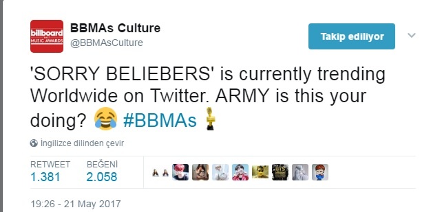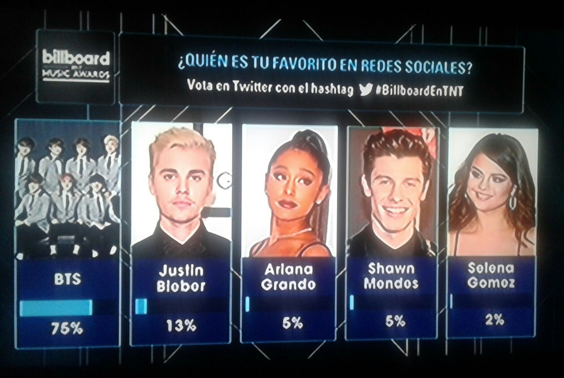 Tam olarak şuan, BTS’in Top Social Artist kategorisinin galibi olduğu açıklandı – oy hakimiyetinden dolayı vu pek de sürpriz olmadı. BTS; Justin Bieber, Selena Gomez, Ariana Grande ve Shawn Mendes gibi diğer yarışmacılara karşı kazandı.