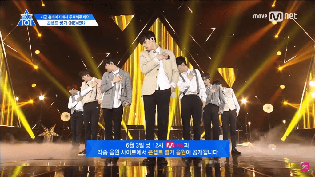 Hwang Min Hyun, Kim Jong Hyun, Kim Jae Hwan, Ong Sung Woo, Lee Dae Hwi, Park Woo Jin ve Lai Guan Lin “Never” takımı performansları ile yarışmanın kazananı olmadı fakat bu şarkı ile listelerde hızla birinci sıraya yükseldiler.