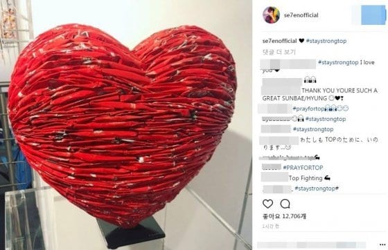 Instagram hesabından Big Bang’den T.O.P’ye gönderdiği mesajında acısını ve üzüntüsünü bir T.O.P’ye güçlü olmasını söyleyerek gösterdi. 07 Haziran’da Se7en bir kalp fotoğrafı ile , “#staystrongtop.” hastaghine destek mesajı attı. Eski YG Entertainment çalışanı Se7en şu anda sağlık durumu ciddiyetini koruyan ve hastahanede olsn T.O.P için hayranların başlattığı #staystrongtop hastaghinde hayranlara ithafen teşekkür mesajı yayınlarken T.O.P’ye de yalnız olmadığını ; “Teşekkürler. Senin böyle bir sunbaen(kıdemli) ve hyungun(ağabey) var” yazarak söyledi.