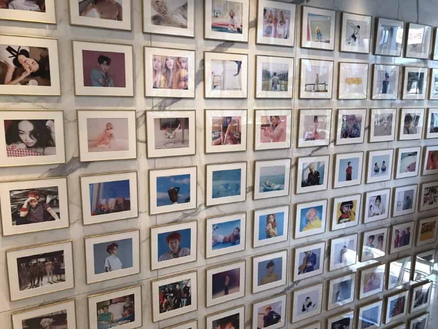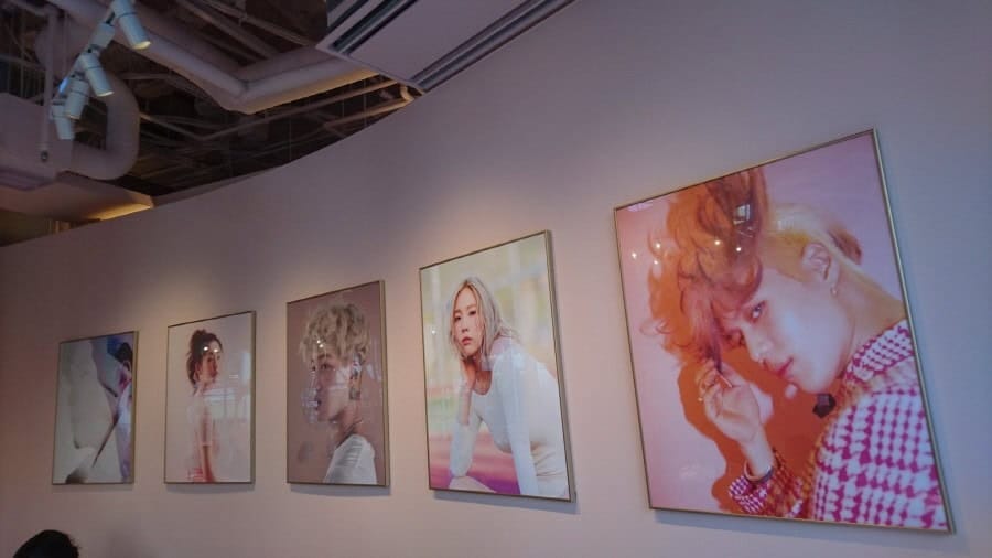 Restaurantın duvarları SM sanatçılarının fotoğraflarıyla ve eşyalarıyla renkli bir şekilde dekore edilmiş.