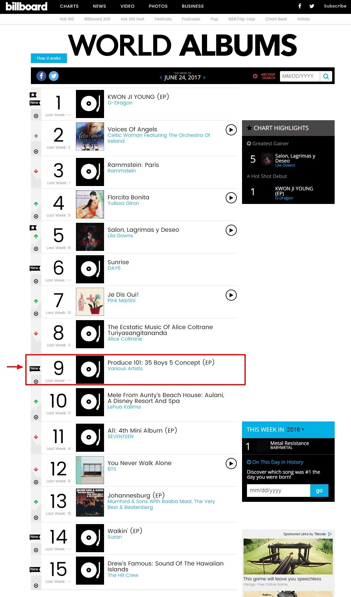 “Produce 101 Season 2” nin ilk 35 stajyeri, kavramsal zorluklardaki şarkıları içeren “Produce 101: 35 Boys 5 Concepts” başlıklı şarkını serbest bırakmayla Dünya Albümleri grafiğine da kavuştu. Mini albüm grafikte 9. sıradan gösterime girdi.