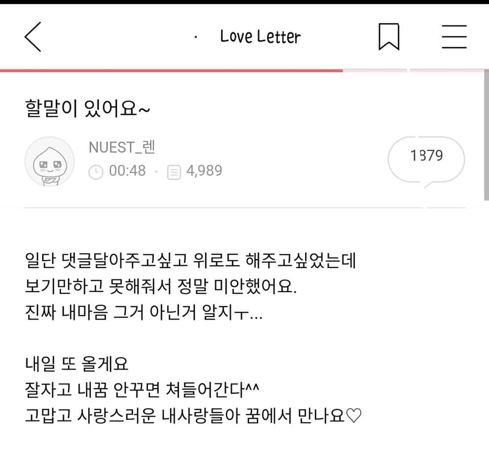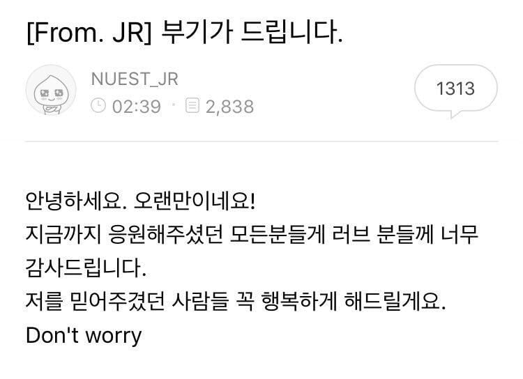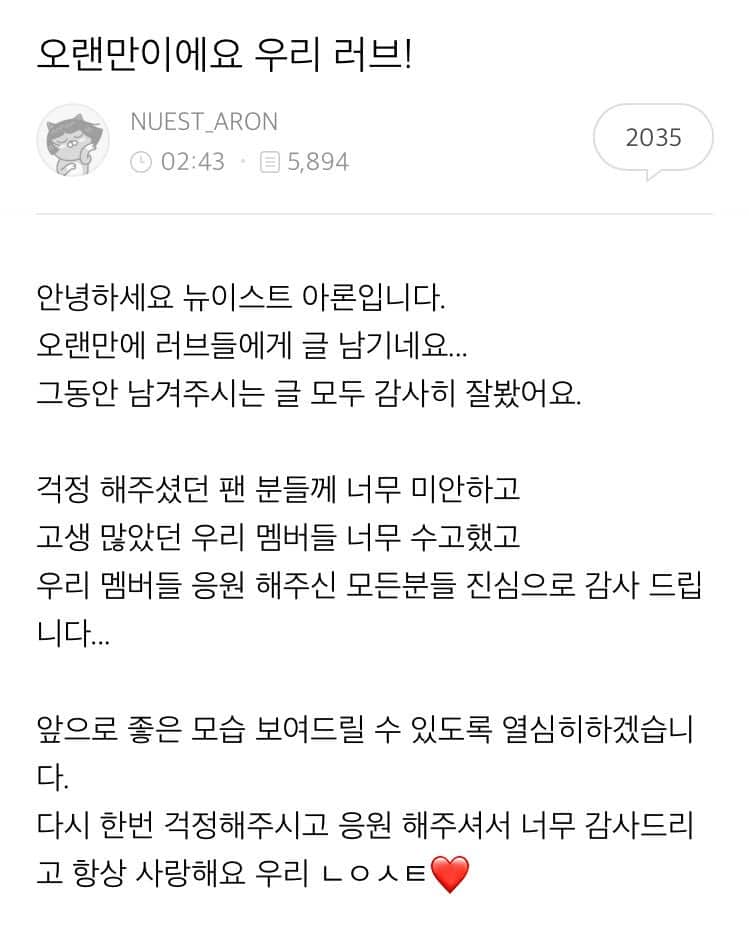 Merhaba ben NU’EST’in Aron’u. LOVE’lar için bir şeyler yazmayalı uzun zaman geçti. Desteklediğiniz için çok teşekkür ederim. Tüm mesajlarınızı gördüm. Tüm fanları endişelendirdiğim için çok üzgünüm. Siz benim için çok acı çektiniz ve diğer üyelerimiz de çok çalıştı. Üyelerimize olan desteğiniz için tüm samimiyetimle teşekkür ederim. Gelecekte, size havalı yönlerimi göstermek için çok sıkı çalışacağım. Bir defa daha benim için endişelendiğiniz ve beni desteklediğiniz için çok teşekkür ediyorum. Sizi daima seviyorum bizim L.O.ㅅ.E’larımız <3 (NU’EST’in fandom adı LOVE-L.O.ㅅ.E)