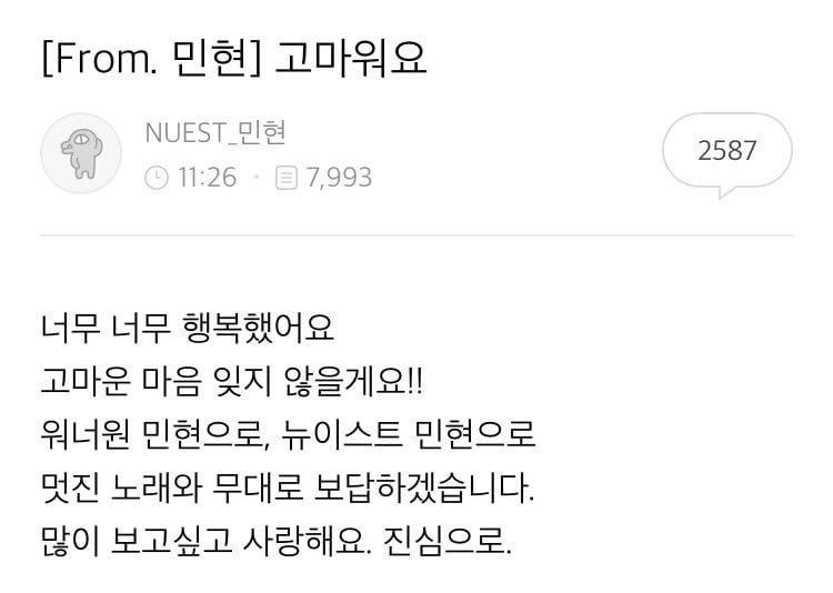 “Ben çok çok mutluydum. Bu minnettarlığı asla unutmayacağım. Wanna One’ın Minhyun’u, NU’EST’in Minhyun’u. Bunu size müthiş şarkı performansları ile ödeyeceğim. Sizi çok özledim ve sizi seviyorum. Tüm içtenliğimle.”