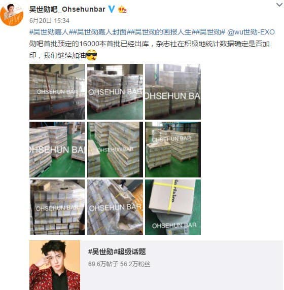 Çin’deki sosyal medya sitesi Weibo’da yer alan ‘Oh Sehun Bar’ adlı Sehun’un fan kulübü, son günlerde kapağında EXO Sehun yer aldığı Marie Claire moda dergisinden 16,000 kopya satın aldı.