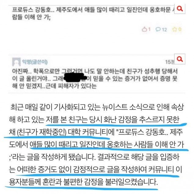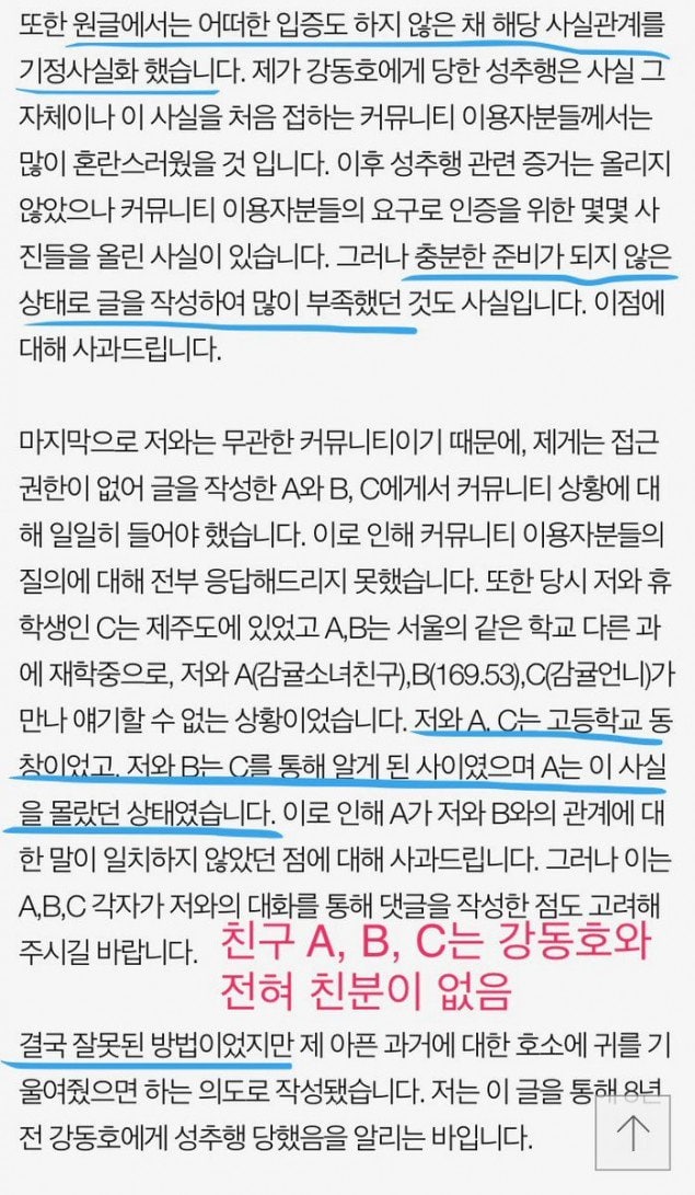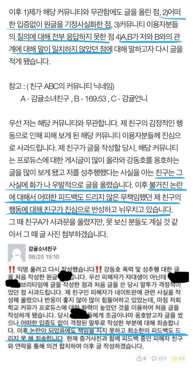 Başlangıçta Baekho’nun zorbalık(cinsel taciz ile birlikte) olayını yayınlayan kişilerin kendileri Baekho’yu tanımıyorlardı. Sadece ilk suçlayan ve mağdur olduğunu iddia eden kişi sayesinde olayı öğrenmişlerdi. Mağdur olduğunu iddia eden kişi 3 arkadaşı adına özür diledi. Hikayedeki kısımlar eşleşmediği için zorbalık kısmının uydurma olduğunu söyledi ve “Yanlış bir yöntemdi. Onlar da benim hikayemi insanların dinlemesi niyetiyle yazdılar”dedi.