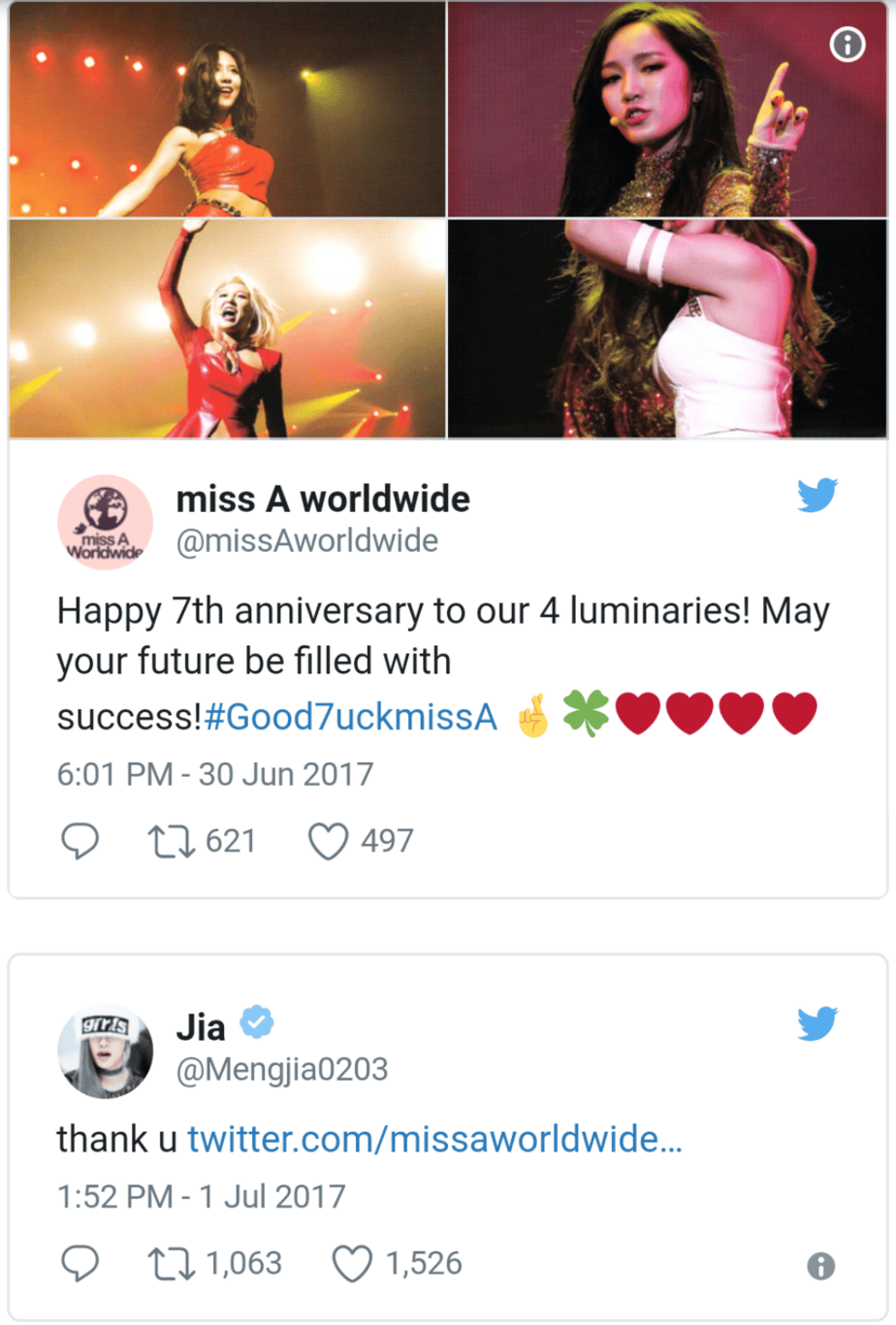 Eski üye Jia kariyerine solo sanatçı olarak devam etsede Instagram hesabından miss A’nin yedinci Yıldönümünü kutlayarak vefasını gösterdi.