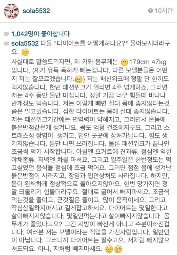 ” Biliyorum bu şekilde diyet yapmak sağlığıma zararlı. Şiddetli diyetler kesinlikle senin sağlığın içinde zararlı. Moda haftasında bağışıklık sistemim zayıflıyor ve tüm vücudumda kırmızı noktalar çıkıyor. Ayrıca derim çok kuruyor. Hem de strese bağlı bağırsak enflamasyonu sorunum var ve ağzımın içinde bir sürü kesikler oluşuyor. Hiç enerjim de olmuyor. Sürekli bayılıyorum. ” CHOI SO RA