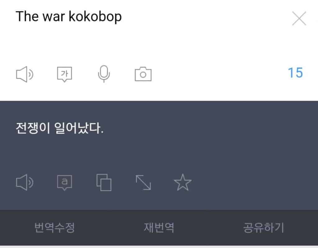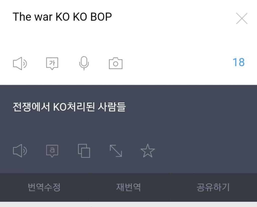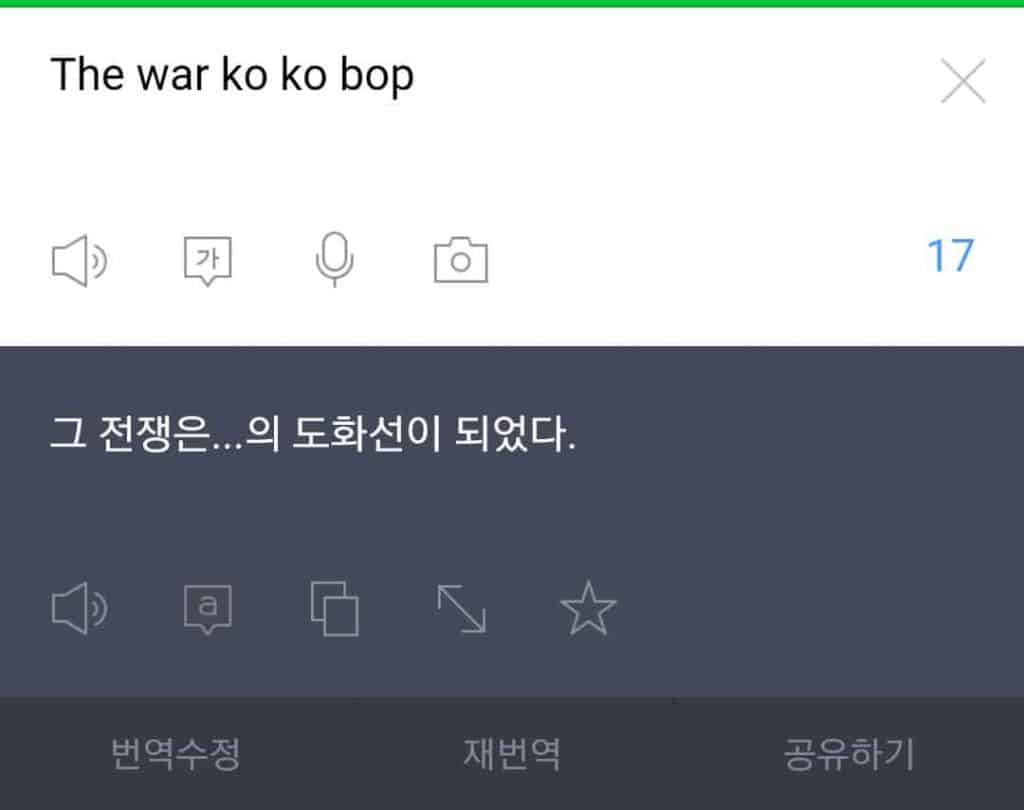 Güney Kore’nin ünlü arama motoru Naver‘ın çeviri uygulamasında çeşitli biçimlerde boşluk bırakma ve büyük harf kullanarak “The War” ve “Ko Ko Bop” ibarelerini tercüme etmeye çalıştığınızda, çevirinin sonucunun bize anlamsal sözcükler veriyor.