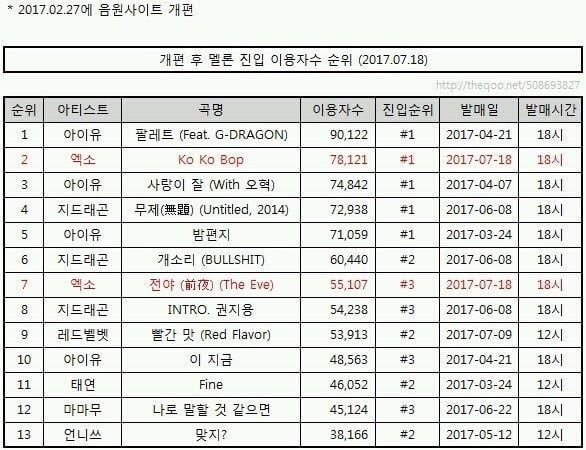 EXO, Melon’da şarkıların gece yarısı yayınlanma yasağından sonra, Melon üzerinde 1 saat içerisinde en yüksek benzersiz dinleyici sahip sanatçılar arasında 2. oldu.