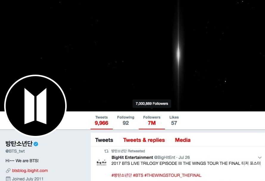 28 Temmuz günü Kore saatine göre 16.00’da, grubun resmi Twitter hesabı 7 milyon takipçi sayısını geçti. Hesap 28 Mayıs’ta 6 milyon takipçi sayına ulaşmıştı. Tam olarak 2 ay sonra ise 1 milyon takipçi arttırarak 7 milyon takipçiye sahip oldu.