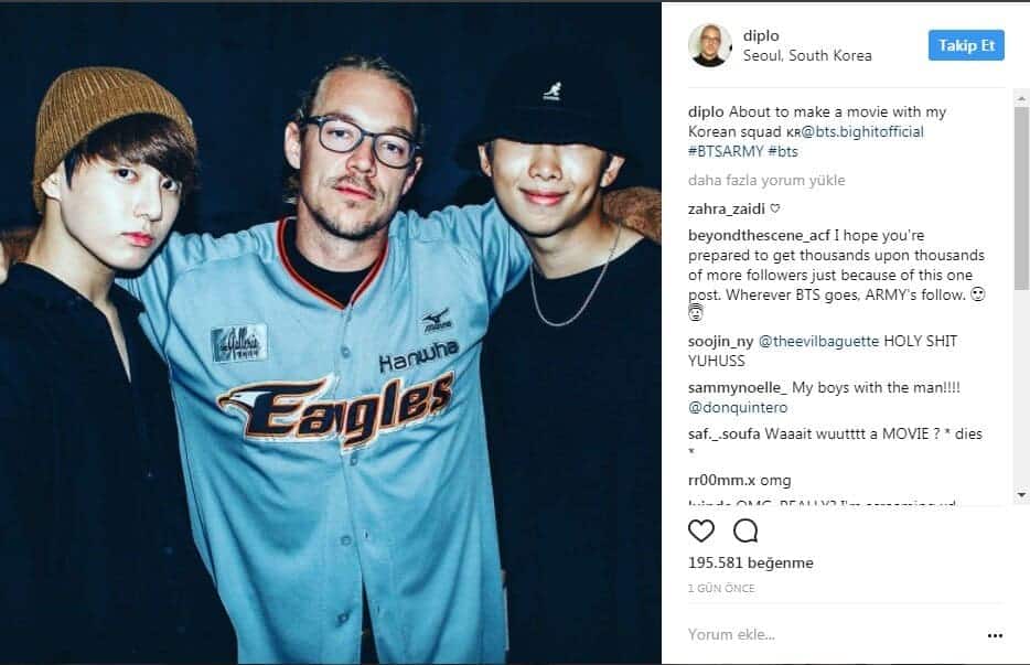 [Güncelleme]Diplo,kişisel Instagram hesabında BTS ile bir film yapacağını paylaştı.Diplo şöyle yazdı: