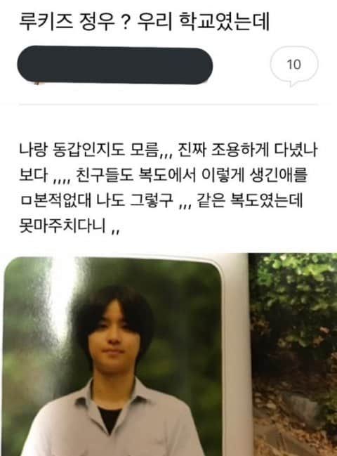 2. [+15][-0] Stajyer olduğunu kimselere söylememiş gibi görünüyor..ㅋㅋㅋ Rookies’ Jungwoo kim mi? Aynı okuldaydık.. Hakkında çok fazla birşey bilmiyorum. Aynı yasta olduğumuzu öğrenince gerçekten şok oldum.. Stajyer olduğunu kimseye söylememiş ve anlaşılan o ki bu konuda ağzı bayağı sıkıymış.. Aynı okuldayız ama hiçbir arkadaşım onu okulda görmemiş.. Gerçekten aynı okula gidip onu nasıl göremediği mi anlayamıyorum.