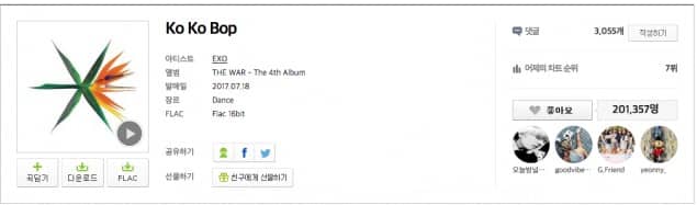 EXO grubu,Melon‘da ”Ko Ko Bop” adlı şarkıları için 200.000’den fazla beğeni aldı.Ayrıca,en kısa sürede bu rekoru elde eden ilk erkek grubu oldu.