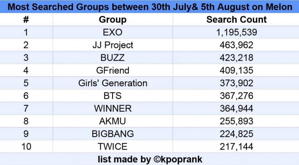 MelOn üzerinden 30 Temmuz ile 5 Ağustos’ta 1,195,539 arama sayısı ile EXO bu haftada aramalarda 1. oldu.